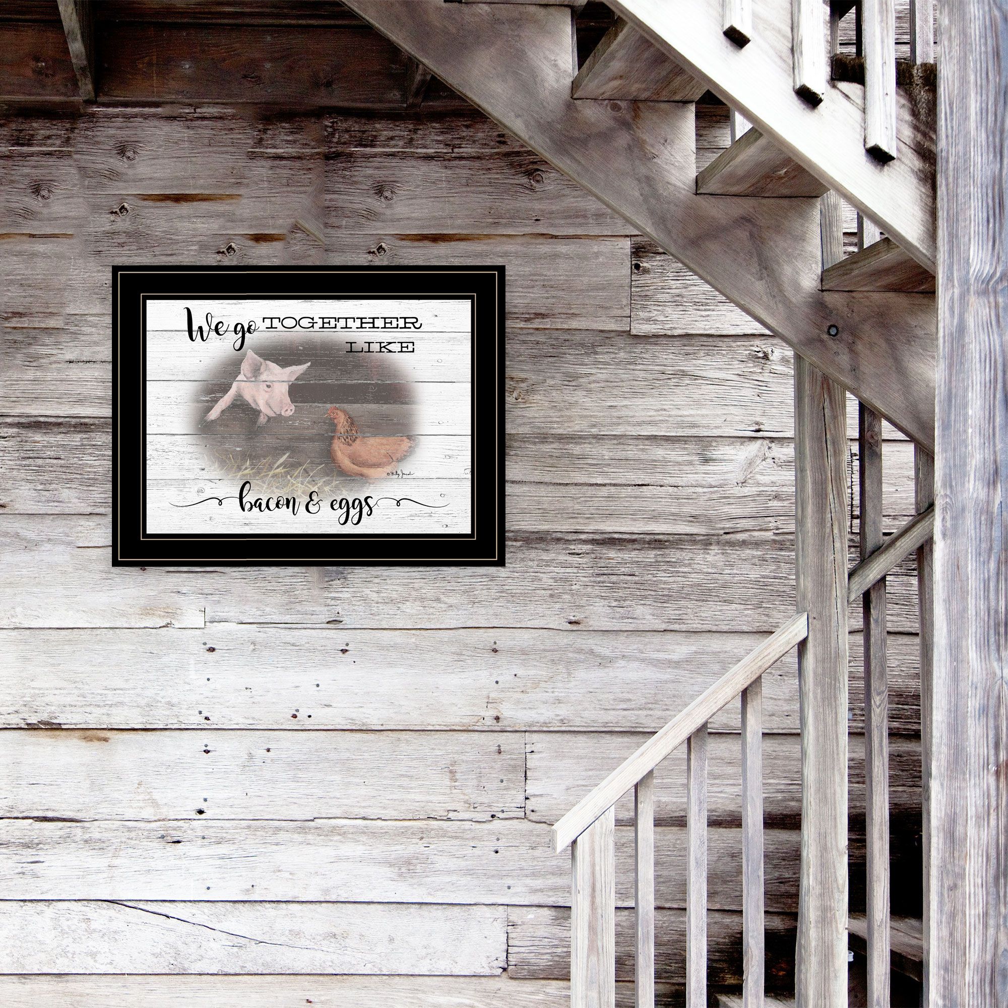 BJ1215-704G "We Go Together" by artist Billy Jacobs, in a decorative grooved (15x19) black frame. This art features a homestead setting (barn setting, pig, chicken ) wooden background of shiplap. This in a pig and chicken talking and saying "We go Together like bacon & eggs! ". This piece of artwork is done by the famous Ohio artisan Billy Jacobs. The surface of the print is textured with a fade resistant coating so no glass is necessary. Arrives ready to hang. Made in the USA by skilled American workers. •Textured Artwork with a 'rolled on' acid free acrylic coating to create a canvas painting effect. No glass is necessary.•Surface of the print has a fade resistant coating.•Arrives Ready to Hang•Woman Owned Business (WBE)•Handmade in the USA•Decorative Moulding adds natural beauty to the framed art.