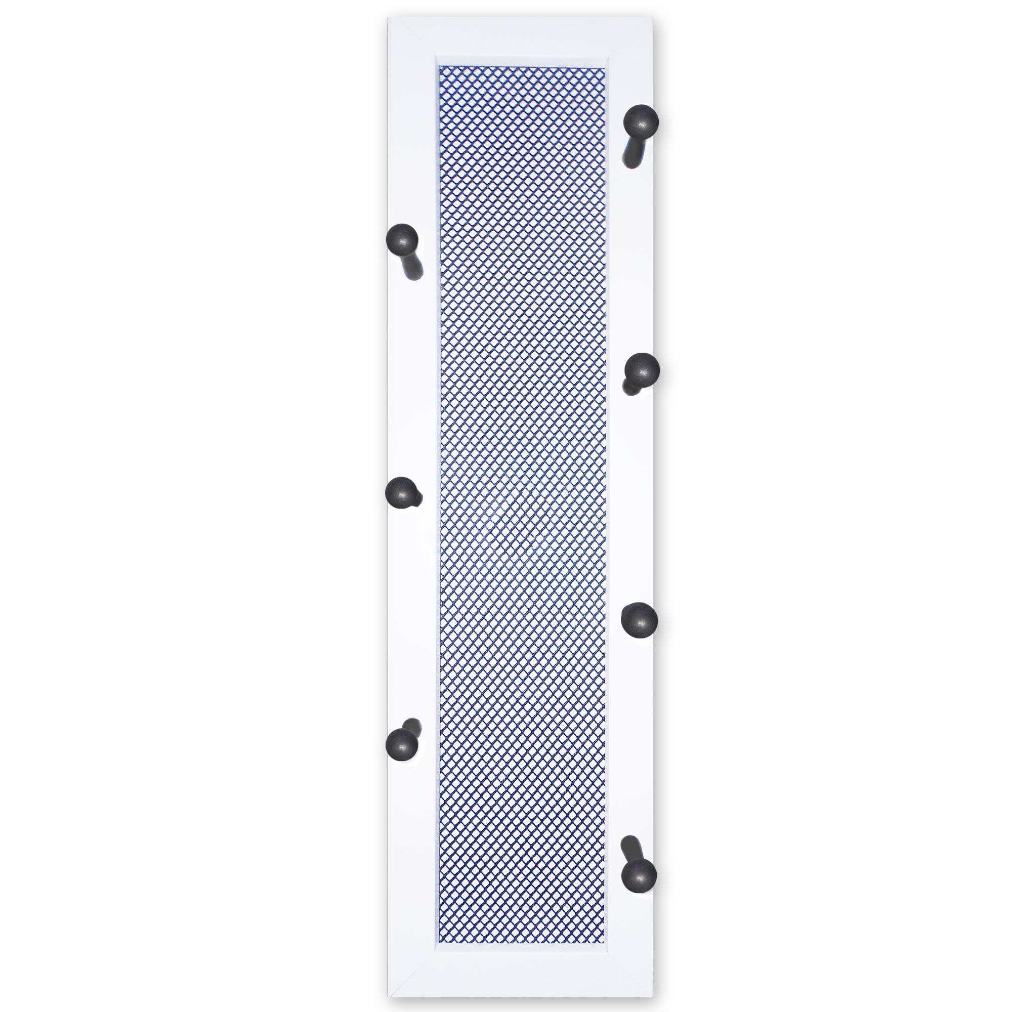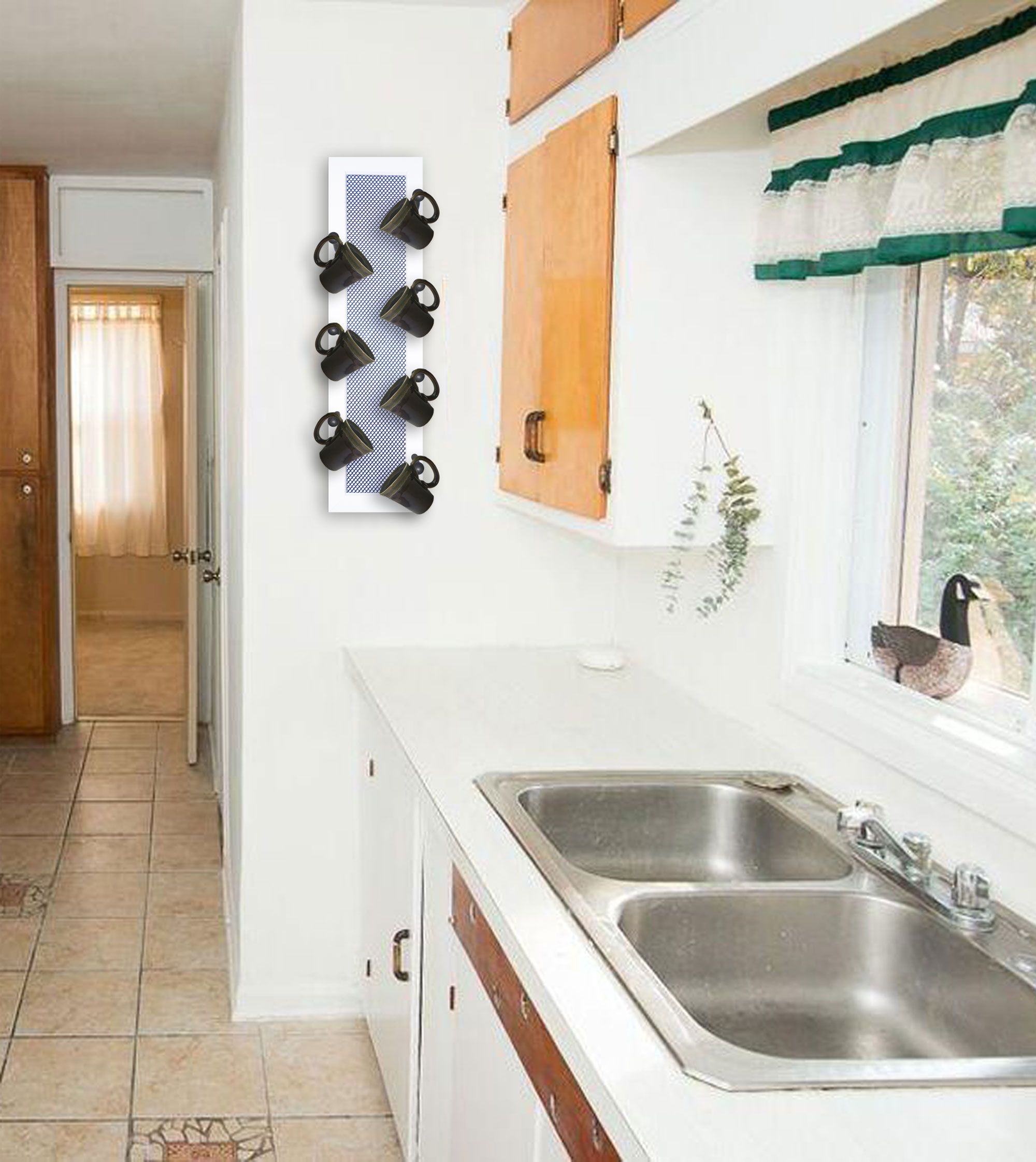 MUG7V-712W Mug Rack - 7 peg mug rack (mugs not included)26 x 7 x 3 by Trendy Decor 4U, in a decorative white frame with black mesh center panel. Works well with other kitchen decor items like our "Kitchen is the Heart of the Home" framed art. Holds up to 7 mugs or be inventive and use it for towels, key rings, or double strung candles. Arrives ready to hang horizontal or vertical. •Mug Racks Frame matches other pieces in our line. •Functional Wall Art: use for jewelry, candles, mugs• MOULDING adds natural beauty. Mug Rack is keyholed for ease of hanging.•THIS FINE HOME DECOR piece made in the USA by Woman Owned Business (WBE) is a perfect gift for a friend or relative.