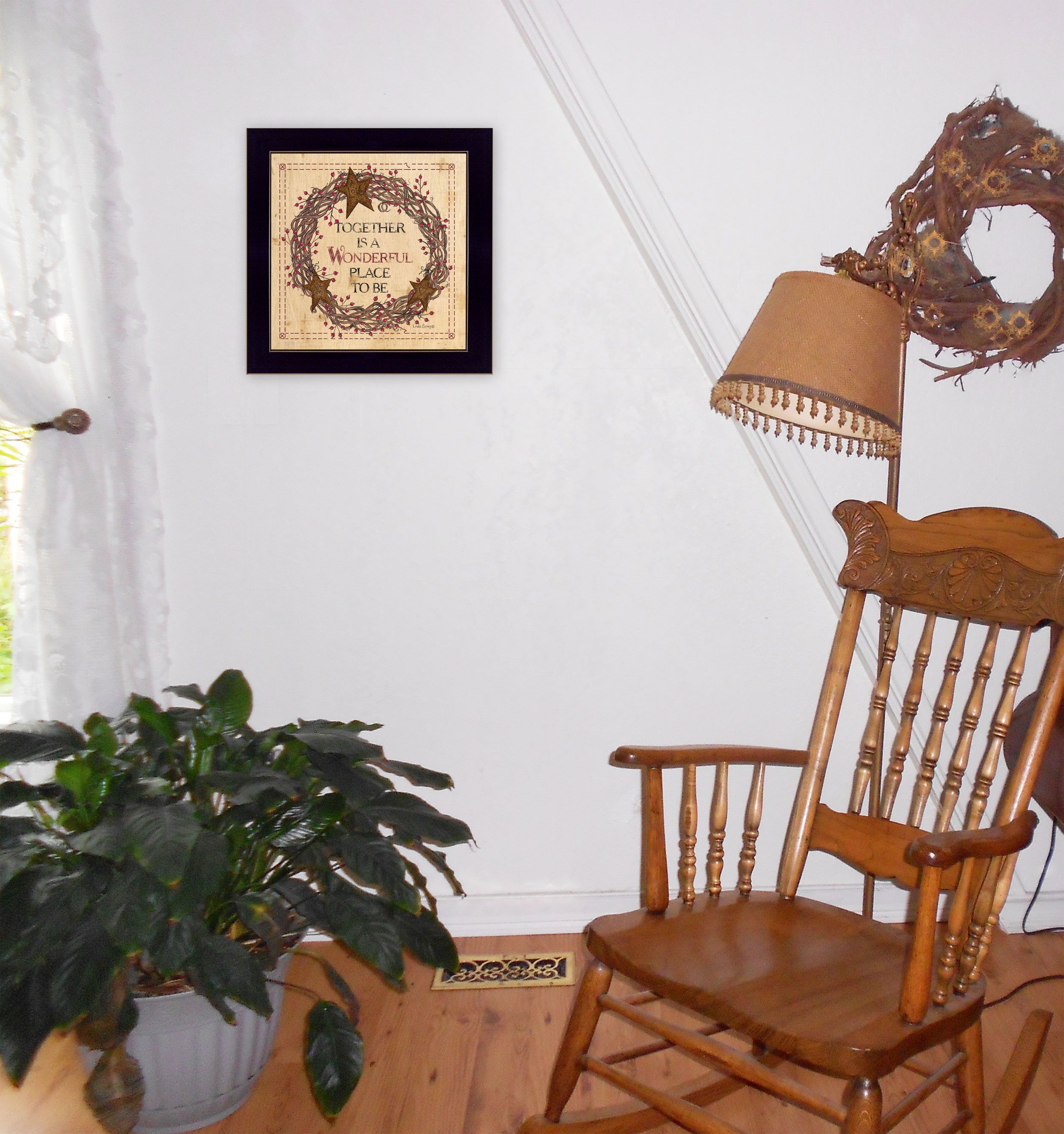 Together is a Wonderful Place to Be This decorative black framed print 14"x14" of a primitive wreath with a star and berries and saying "Together is a Wonderful Place to be". Framed print has a UV coating (glass is not needed)arrives ready to hang.•TEXTURED ARTWORK with a 'rolled on' acid-free acrylic coating to create a canvas painting effect.•UV PROTECTANT COATING protects artwork from fading. No glass is necessary.• MOULDING adds natural beauty to the framed art. Frame is keyholed for the easy hanging.•THIS FINE HOME DECOR piece made in the USA by Woman Owned Business (WBE) is a perfect gift for a friend or relative.