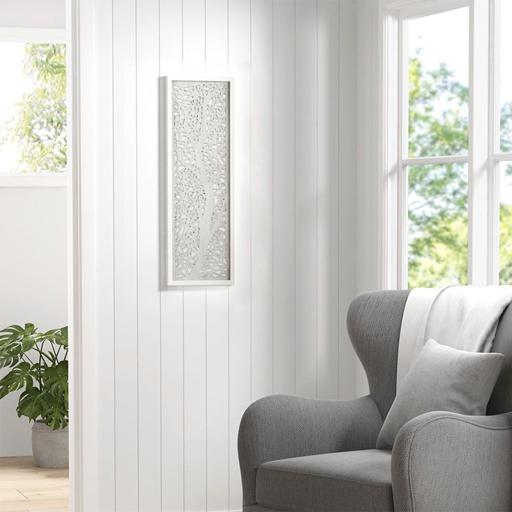 Revive your home with our Madison Park Laurel Branches Laser Cut Tree Framed Panel Wall Decor by Artist Emily Warne. This alternative wall art features a laser-cut MDF botanical branch design in a grey tone for a fresh and stylish touch, while the 100% fir wood frame features a whitewashed finish adding a natural and modern update. 4 D-rings are finished on the reverse allowing you to hang this piece both vertically or horizontally, making this beautiful botanical panel piece an easy addition to any room or decor. Measuring 12x36" and featuring 4 D-rings on the reverse, easily hang this piece both vertically or horizontally for a beautiful botanical addition to any room or decor.
