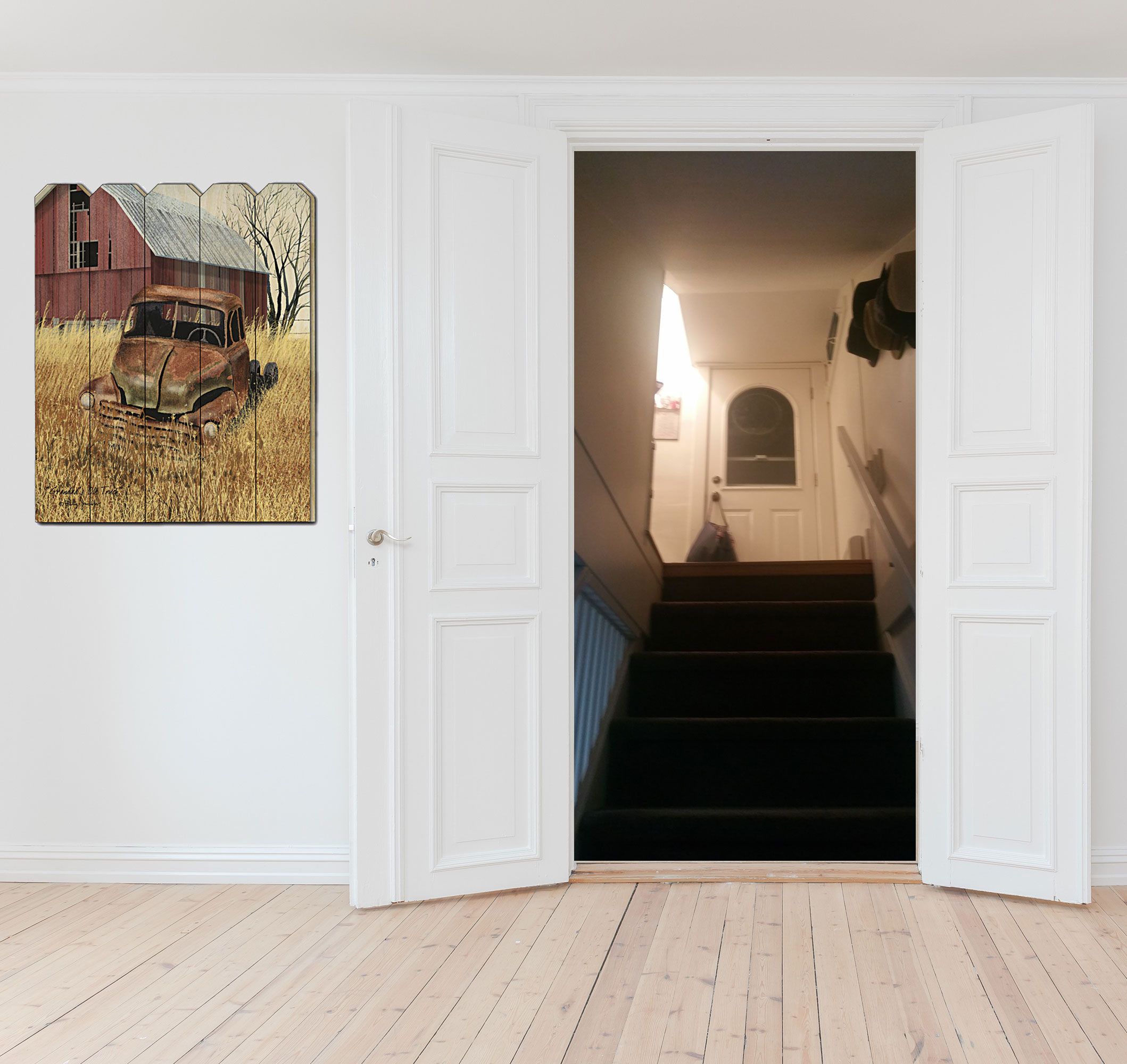 BJ1140P - Granddad's Old Truck by artisan Billy Jacobs. Art printed directly on a 16 x 20 wood picket fence with the scene of an early 50's Chevy pickup rusting away in a field in front of a red barn. Arrives ready to hang. Made in the USA by skilled American workers. • ARTWORK printed directly on wood•Sawtooth hanger on the back makes this beautiful artwork ready to hang.•Baltic Birch grain pattern adds natural beauty to the framed art. Fence has sawtooth hanger for the ease of hanging.•THIS FINE HOME DECOR piece made in the USA by Woman Owned Business (WBE) is a perfect gift for a friend or relative.