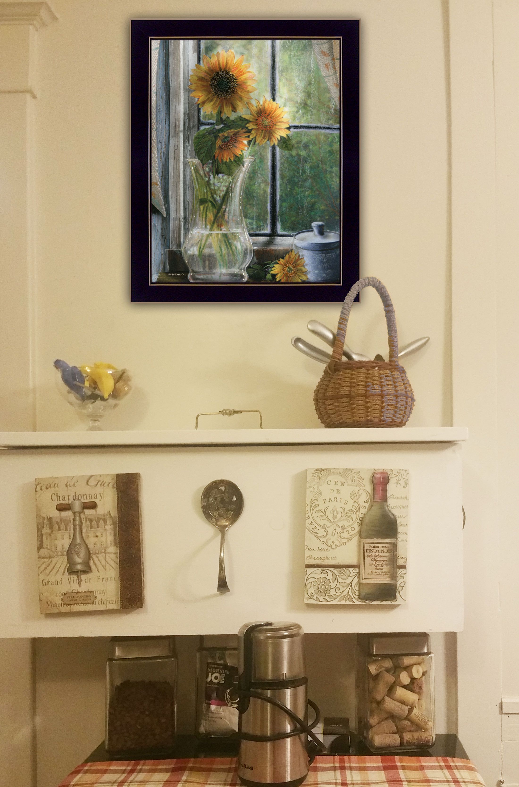 ED263-712 Morning Flower by Ed Wargo, in a decorative 14 x 18 black frame. This art features sunflowers in a glass vase, sitting on a windowsill along with crocks. The surface of the print is textured with a fade resistant coating so no glass is necessary. Arrives ready to hang. Made in the USA by skilled American workers. •TEXTURED ARTWORK with a 'rolled on' acid-free acrylic coating to create a canvas painting effect.•UV PROTECTANT COATING protects artwork from fading. No glass is necessary.• MOULDING adds natural beauty to the framed art. Frame is keyholed for the easy hanging.•THIS FINE HOME DECOR piece made in the USA by Woman Owned Business (WBE) is a perfect gift for a friend or relative.
