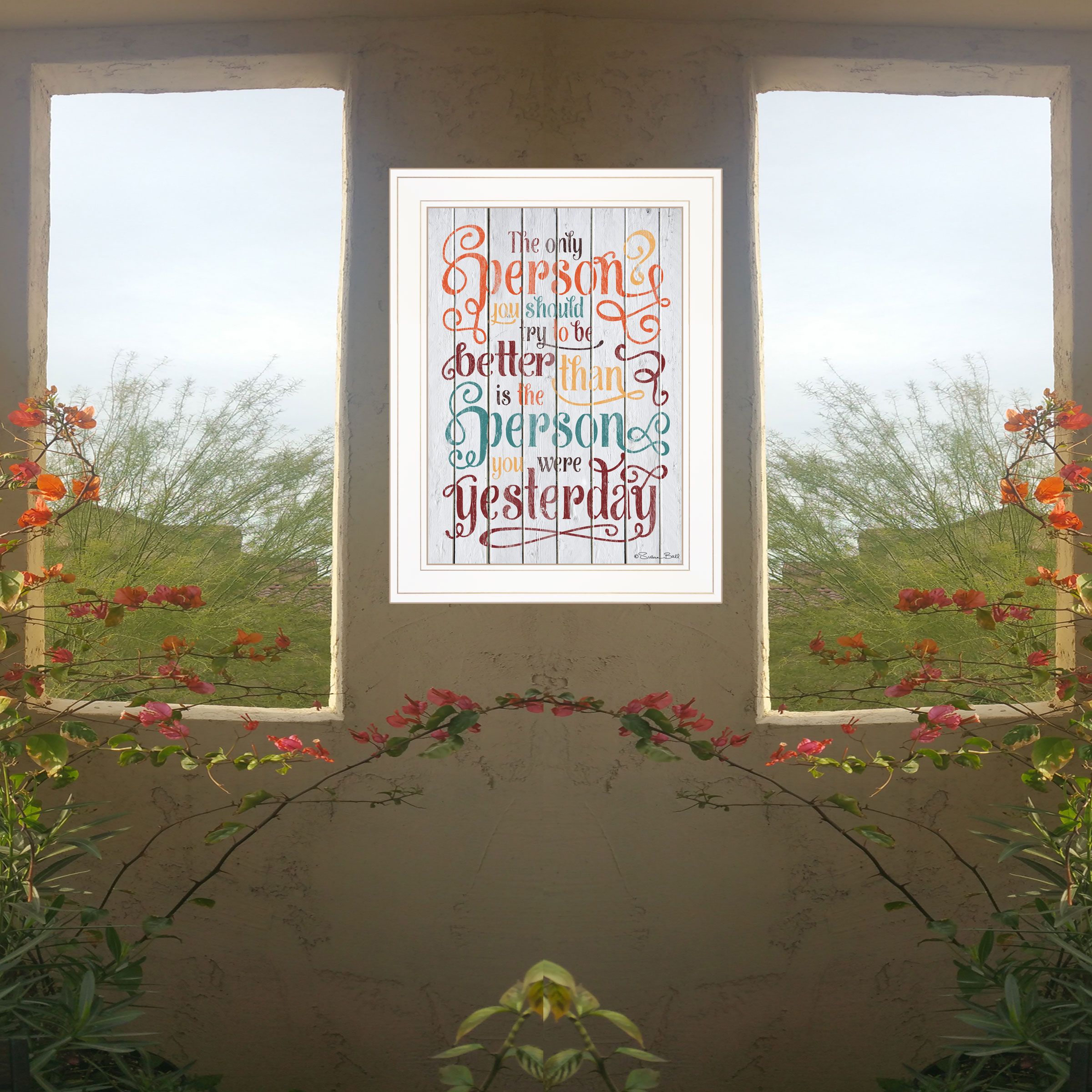 SB378-226G "The Only Person" by artisan Susan Ball. This decorative white framed print 15"x19" on a slatted background has an important message for anyone: The only person you should try to be better than is the person you were yesterday. Our products are proudly made by skilled American workers. The surface of our framed art is textured with a fade resistant coating, so no glass is necessary. A vegetable-based glue is used in the production of our products, and our frames are crafted from 100% recycled material. In keeping with our environmentally friendly approach toward manufacturing. To view a 2-piece vignette, including this print, please search: V601-226G•Print has fade resistant surface texture, no glass is necessary•Woman Owned Business (WBE)•Arrives ready to hang, no additional hardware needed on item•IndIvIdually hand crafted by skilled AmerIcan workers•Clean with Soft Dry Cloth Only