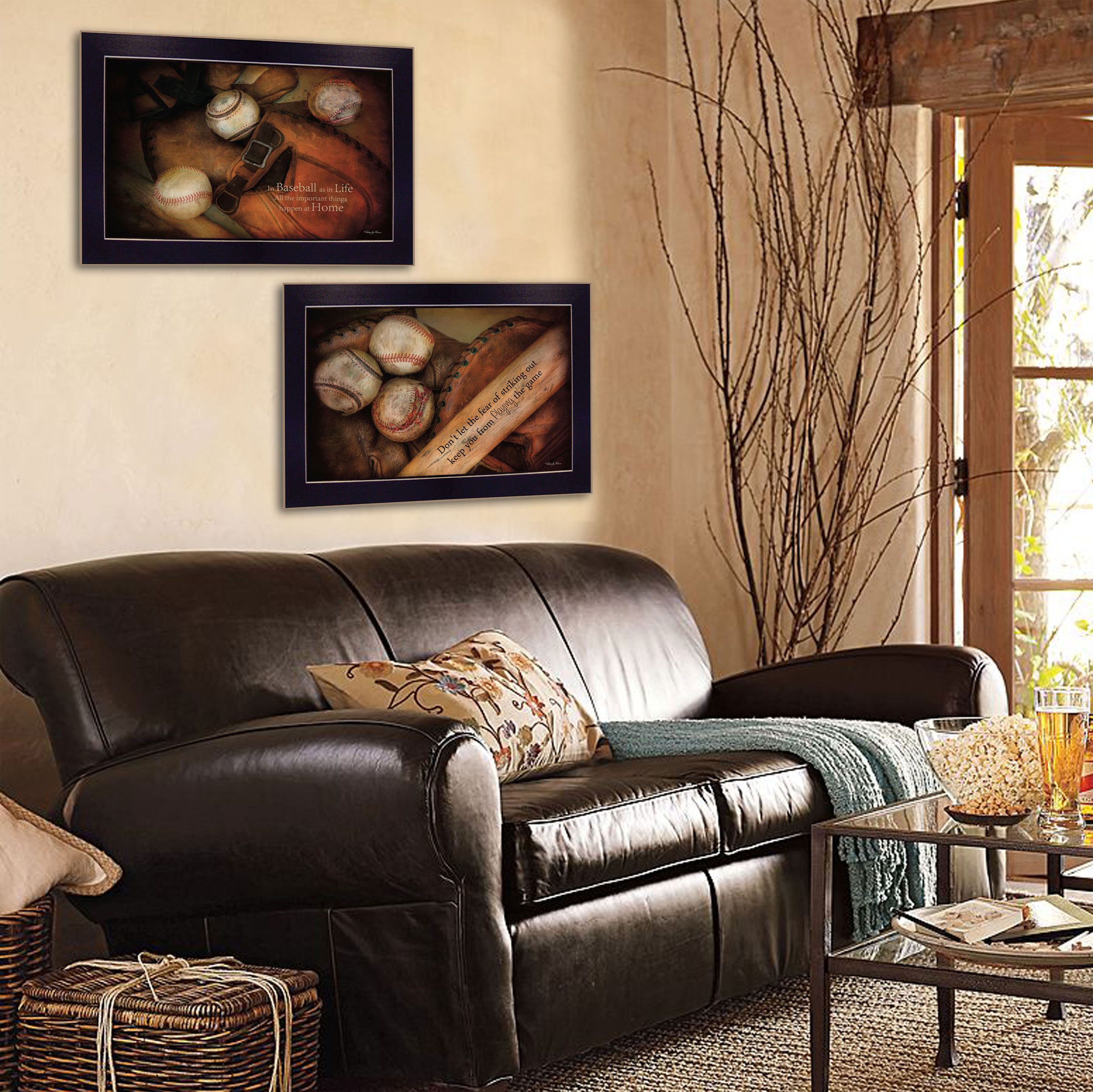 Baseball is 2 - 14"x 20" framed prints by artist Robin Lee Vieira. This 2 piece collection consists of: Batter is a baseball mitt with sayings; such as "Don't let the fear of striking out, keep you from playing the game". Each black framed print arrives ready to hang. •Women Owned (WBE)•Textured Artwork with a 'rolled on' acid free acrylic coating to create a canvas painting effect. No glass is necessary.•UV protectant coating protects artwork from fading.•Arrives Ready to Hang