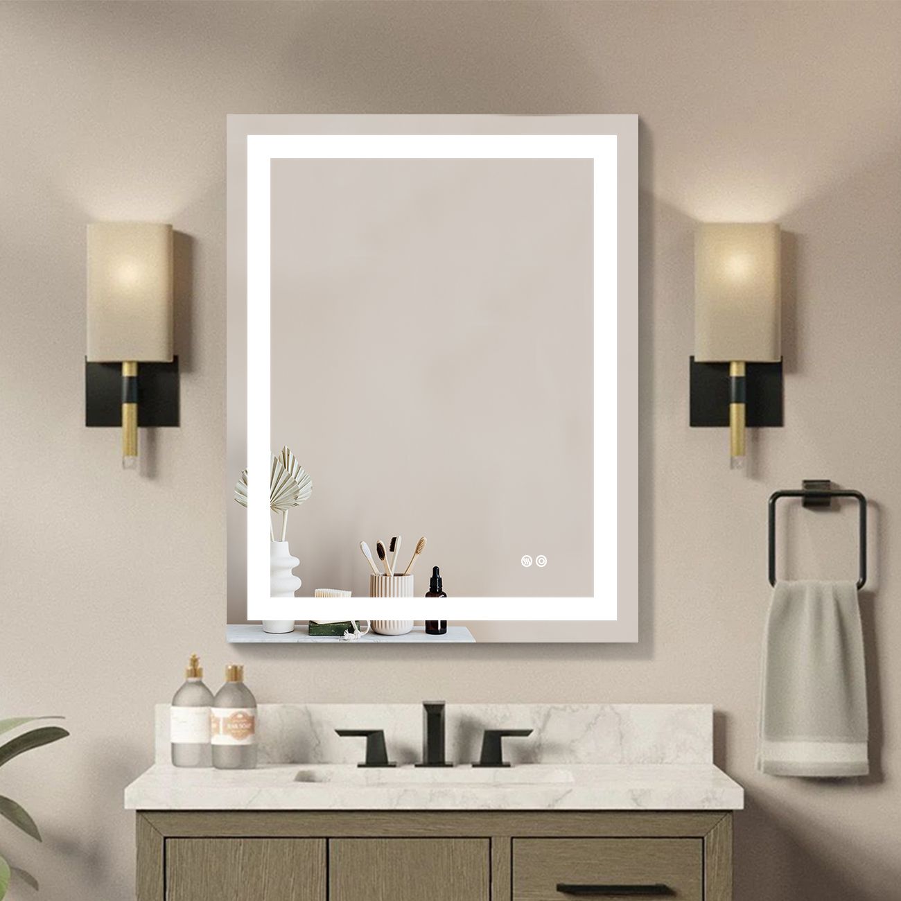 The bathroom mirror with LED light; Made of high qualit Anodized aluminum can be used for long time. High tech Intelligent bathroom vanity makeup mirror with defogging function. Touch sensor button can adjustable mirror color brightness from 2700K-6300K to meet the needs of different light. Brightness can be adjusted freely from 10 % to 100%. Large size bathroom mirrors wall mounted design; it is space-saving. Bright mirror can make your bathroom or living room can be more spacious; Better mood. Perfect for bathroom; bedroom; dressroom; powder room and more.