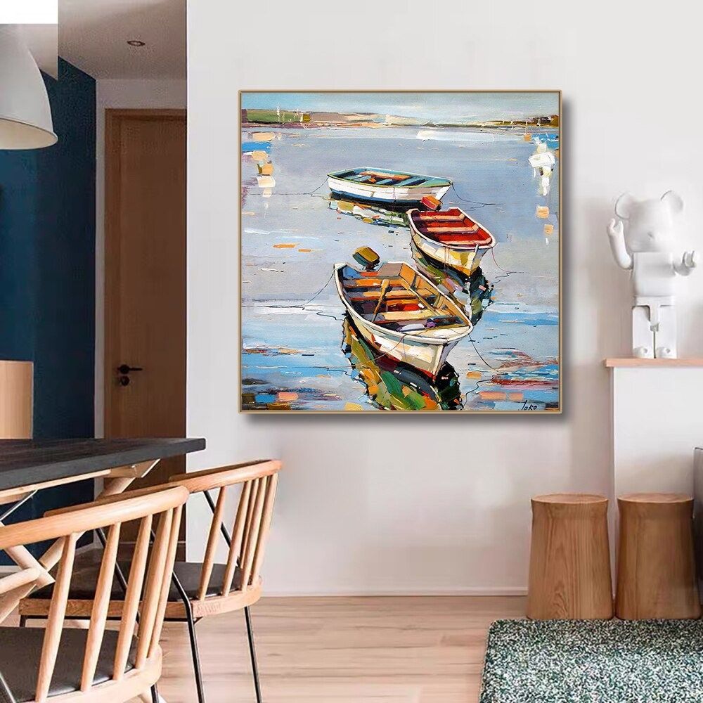 Hand Painted Oil Painting Canoe oil Paintings Nordic Seascape-Hand-Painted- Colorful Boats Oil Painting-Wall Art Handmade- For Home Decoration